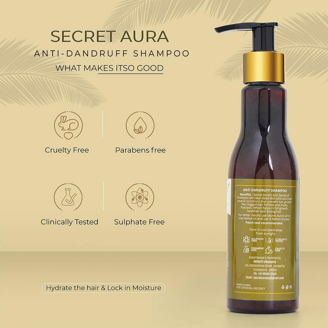 சிறந்த விளைவுகளுக்கு, Secret Aura’s All in One Herbal Oil ஷாம்பூ பயன்படுத்தும் முன் தலைக்கு தேய்த்து வரலாம்.