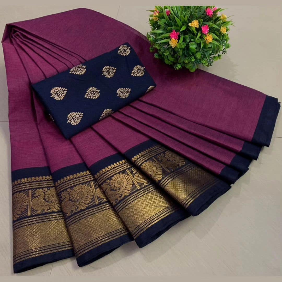 This exquisite Chettinad Cotton Saree in 60/80 count is the perfect blend of tradition and elegance. The saree features a beautiful Royal Purple body, enhanced by a contrasting navy blue border and pallu, accentuated with intricate gold zari work featuring classic peacock and floral motifs. Ideal for women who cherish timeless elegance, this saree is lightweight, breathable, and perfect for festive gatheri